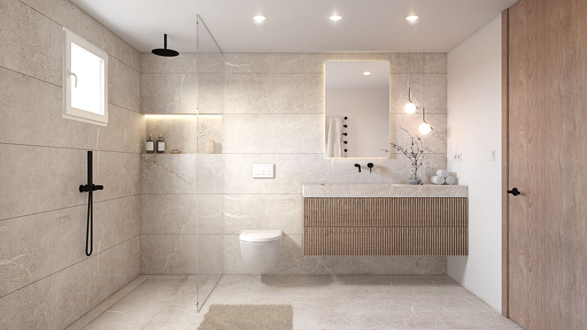 Se trata de una vivienda unifamiliar aislada con piscina de líneas rectas y contemporáneas situada en la ladera de la urbanización de Costa d’en Blanes. Se intuyen entre la densa vegetación dos paralelepípedos, uno revestido en piedra de mampostería tradicional de la zona y el otro enfoscado blanco, sobre un basamento de piedra. Debido a la fuerte pendiente del terreno su acceso se realiza a través de la planta primera por lo que se crea un gran espacio a doble altura en la unión de los dos paralelepípedos que forman la vivienda.